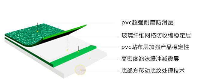 專業的 PVC 運動地板的表面能在受到撞擊時,適度變形,如同一個內有空氣的密封床墊,當使用者在摔跤或滑倒的時候,密閉泡沫背層技術提供的緩沖作用能最大限度的減少運動傷害。
