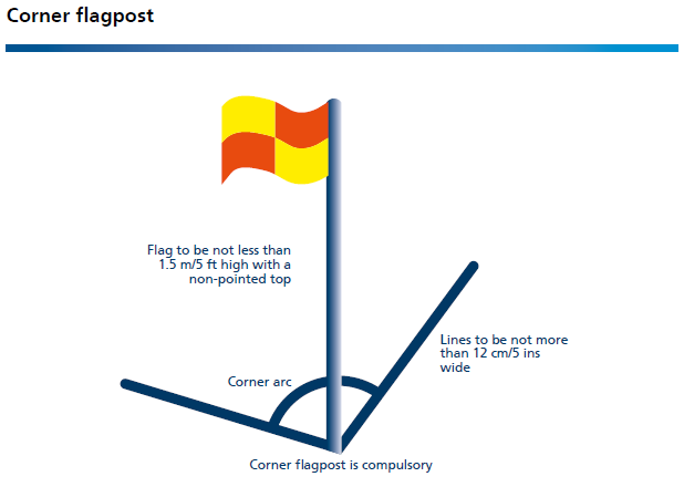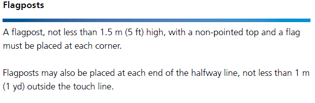 在中線(xiàn)的兩端、邊線(xiàn)以外不少于1米(1碼)處,也可以放置旗桿。