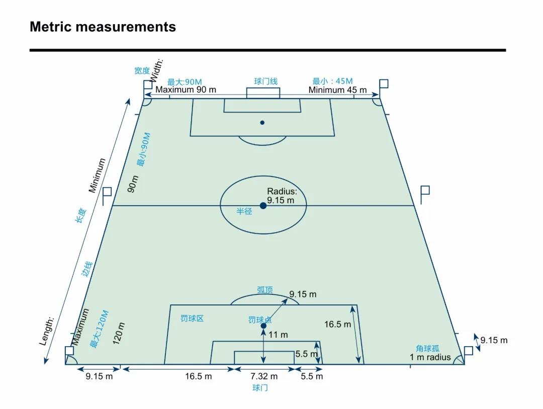 長(zhǎng)度:最短100米(109碼) 最長(zhǎng)110米(120碼)