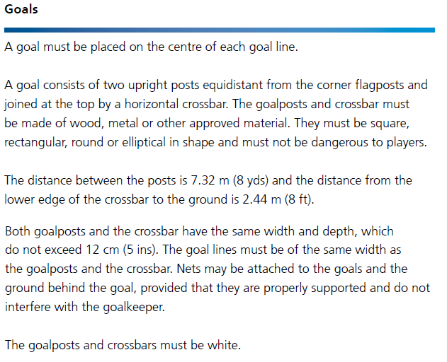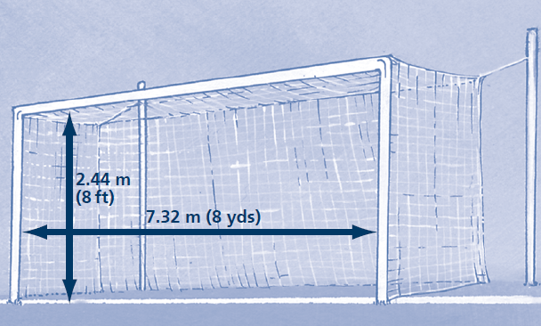 兩根球門(mén)柱和橫梁具有不超過(guò)12厘米(5英寸)的相同的寬度和厚度。球門(mén)線(xiàn)與球門(mén)柱和橫梁的寬度是相同的。球門(mén)網(wǎng)可以系在球門(mén)及球門(mén)后面的地上,并要適當(dāng)撐起以不影響守門(mén)員。