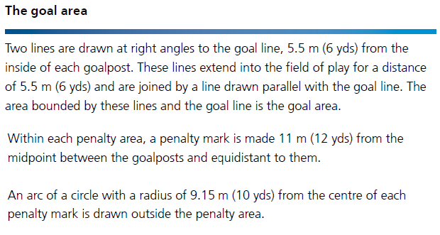 從距每個(gè)球門(mén)柱內(nèi)側(cè)5.5米(6碼)處,畫(huà)兩條垂直于球門(mén)線(xiàn)的線(xiàn)。這些線(xiàn)伸向足球比賽場(chǎng)地內(nèi)5.5米(6碼),與一條平行于球門(mén)線(xiàn)的線(xiàn)相連接。由這些線(xiàn)和球門(mén)線(xiàn)組成的區(qū)域范圍是球門(mén)區(qū)。