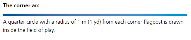 在比賽場(chǎng)地內(nèi),以每個(gè)角旗桿為圓心,畫(huà)一個(gè)半徑為1米(1碼)的四分之一圓。